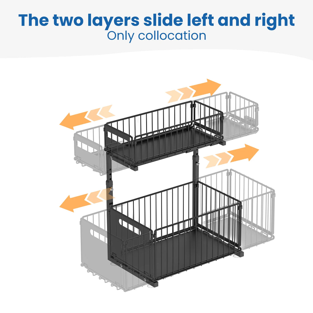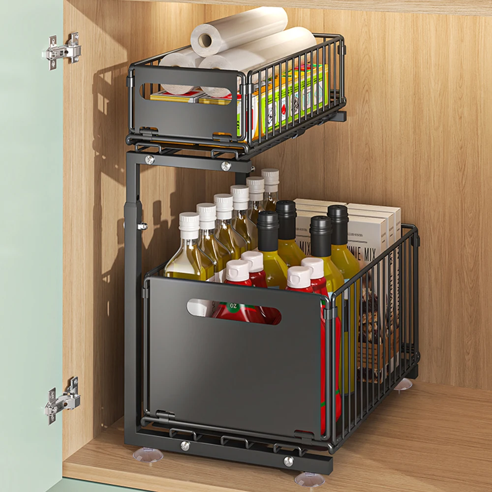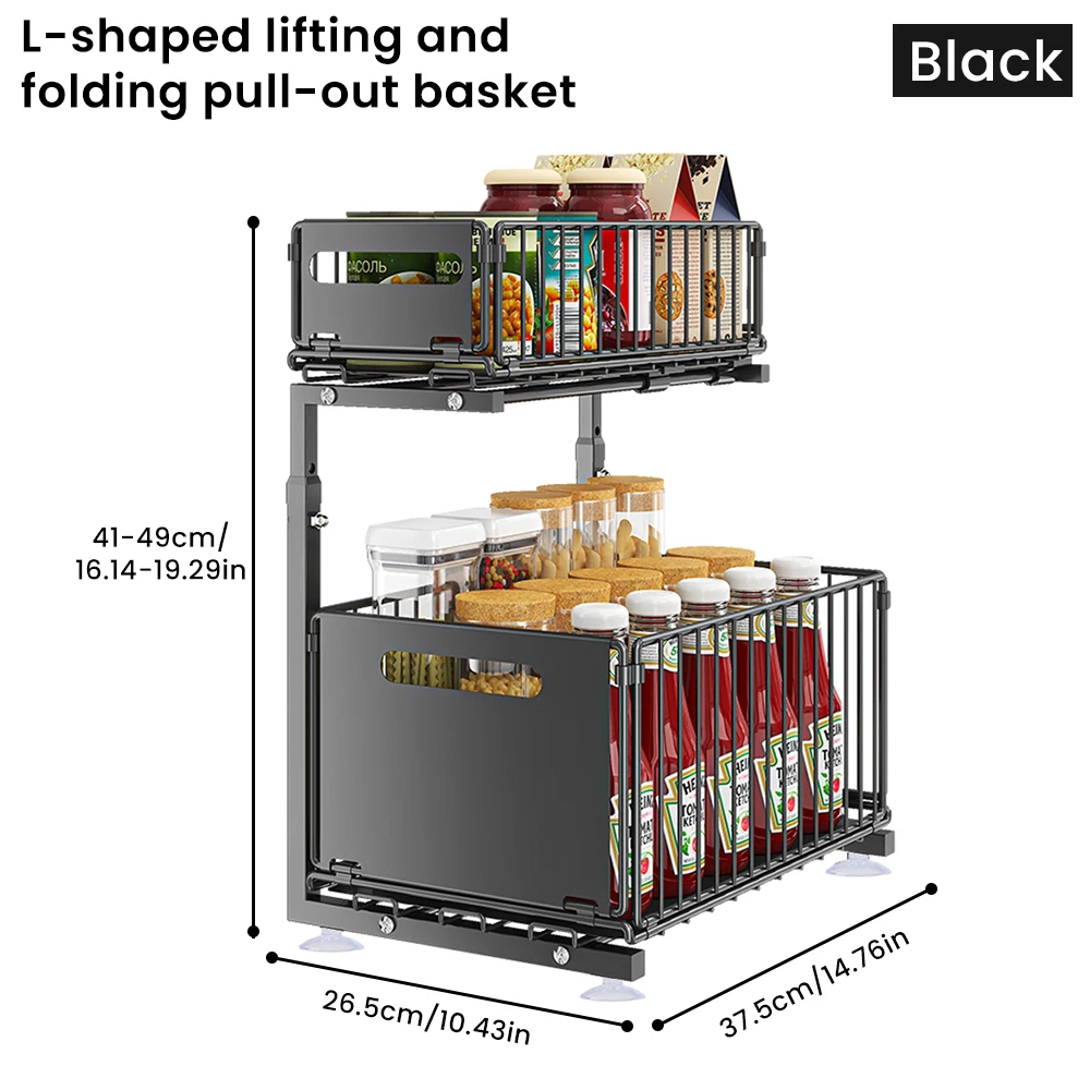 Feature: 【Double Layer Pull-Out】Both of the shelf can pull out individually, cabinet storagestrong enough to hold up to a lot of items 【Height Adjustable】There are 5 height sets on the stand that you can adjust the height by full-extension ball-bearing system. 【Large Capacity Storage】 2-layer storage, with the upper layer storing small items such as short bottles or cloths, and the lower layer storing tall bottles and large objects to prevent bottles from falling. 【Strong Bearing Capacity】Our pull out drawers for cabinets are made of premium carbon steel. The sturdy construction of this sliding cabinet organizer ensures a robust load-bearing capacity, making it easy to storage loose items efficiently. 【Versatile Use】The under-sink organizer is perfect for containing and organizing loose items and keeping them neat. It is a great slide out cabinet organizer for cabinets, kitchen, pantry, bathroom, living room, office, and more Specification: Name: pull out drawers Material: Carbon Steel Color: black Style: Modern Size:37.5cm*26.5cm Height: 41-49cm Function: Multi purpose, movable, installation free Storage rack classification: inside the cabinet