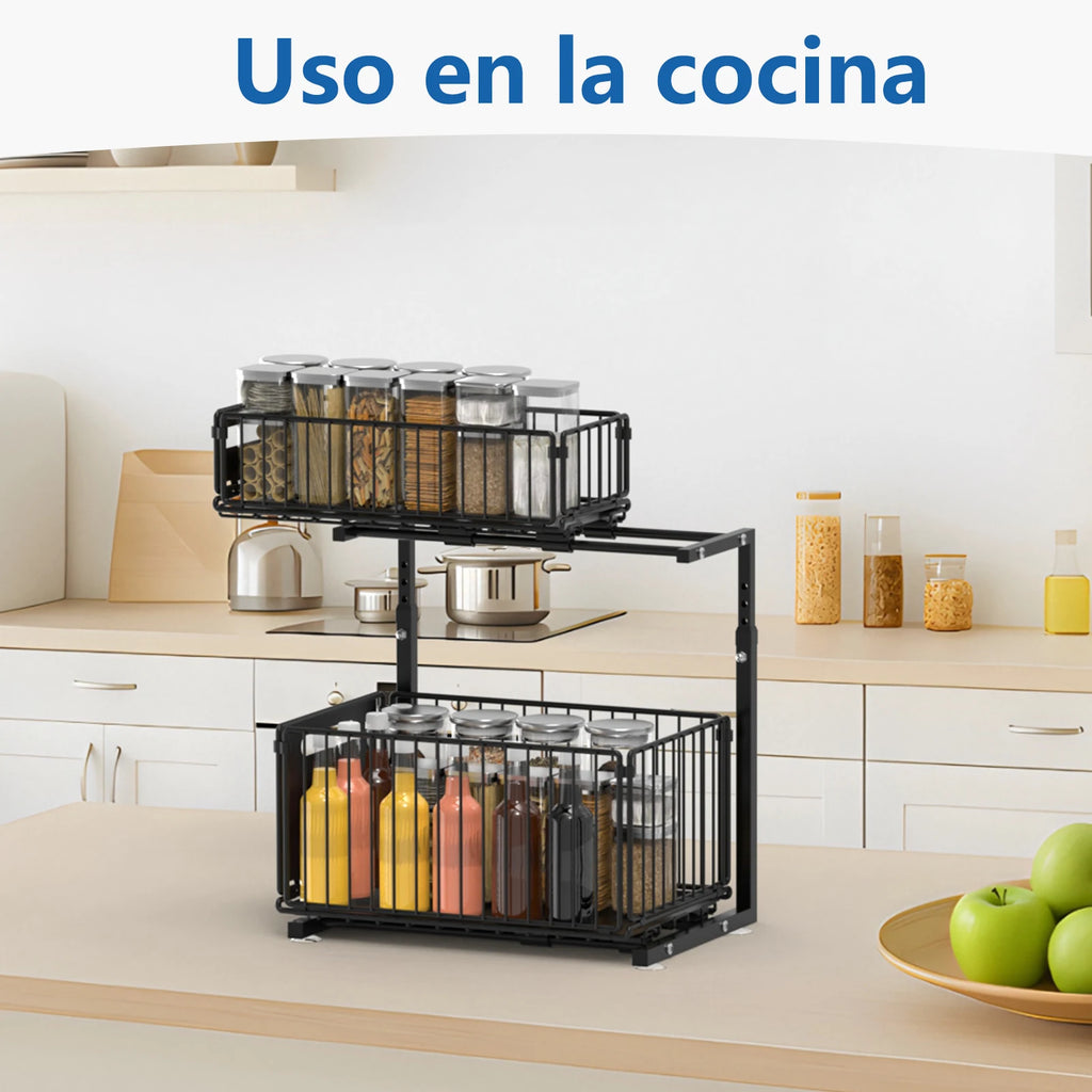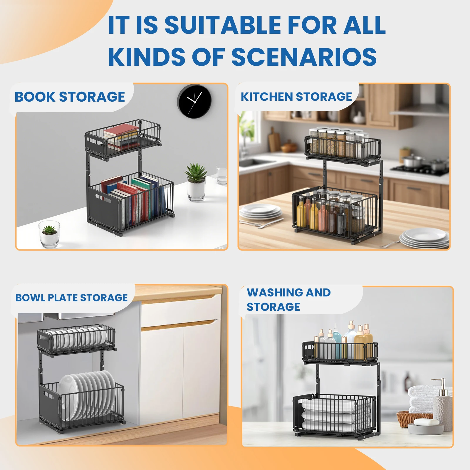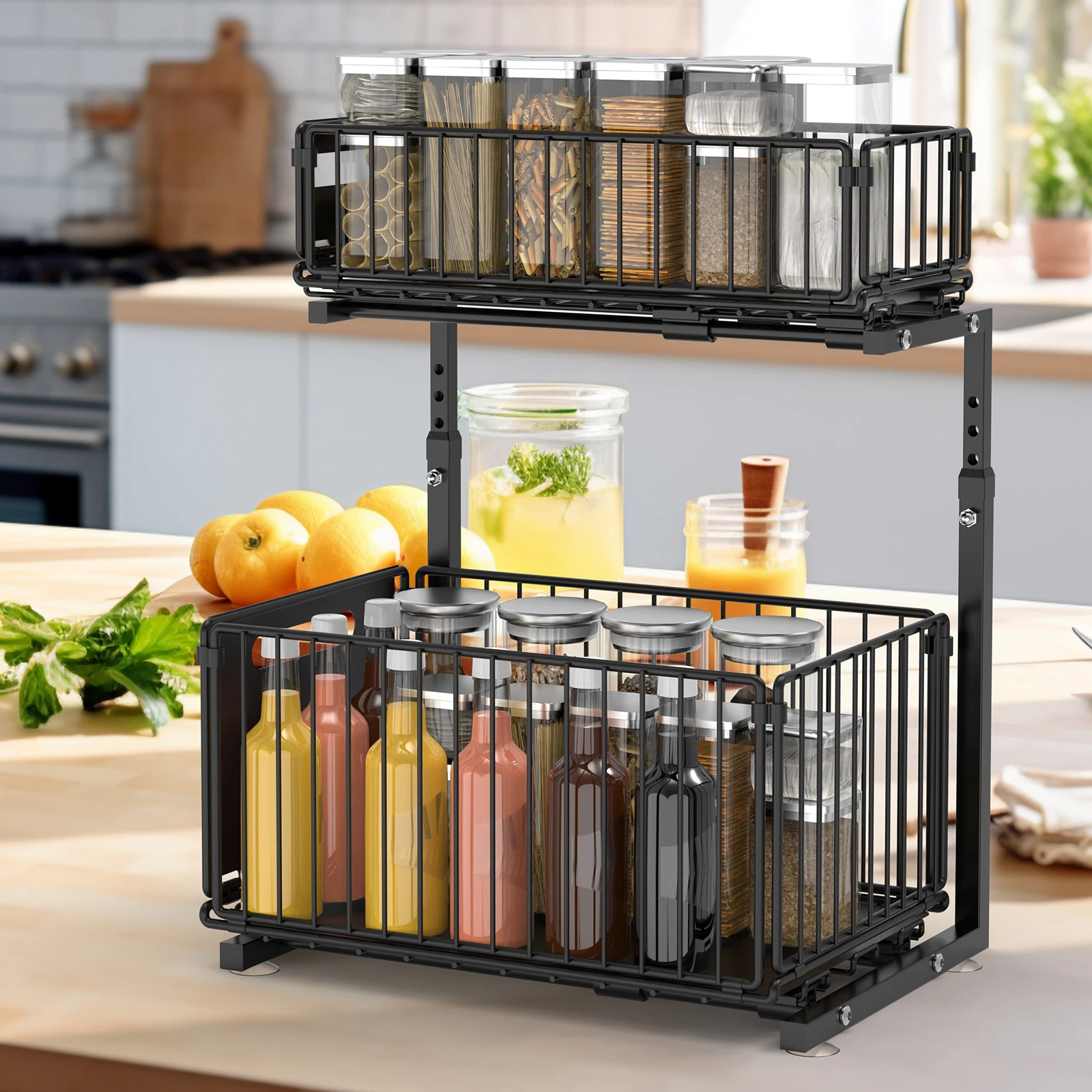 Feature: 【Double Layer Pull-Out】Both of the shelf can pull out individually, cabinet storagestrong enough to hold up to a lot of items 【Height Adjustable】There are 5 height sets on the stand that you can adjust the height by full-extension ball-bearing system. 【Large Capacity Storage】 2-layer storage, with the upper layer storing small items such as short bottles or cloths, and the lower layer storing tall bottles and large objects to prevent bottles from falling. 【Strong Bearing Capacity】Our pull out drawers for cabinets are made of premium carbon steel. The sturdy construction of this sliding cabinet organizer ensures a robust load-bearing capacity, making it easy to storage loose items efficiently. 【Versatile Use】The under-sink organizer is perfect for containing and organizing loose items and keeping them neat. It is a great slide out cabinet organizer for cabinets, kitchen, pantry, bathroom, living room, office, and more Specification: Name: pull out drawers Material: Carbon Steel Color: black Style: Modern Size:37.5cm*26.5cm Height: 41-49cm Function: Multi purpose, movable, installation free Storage rack classification: inside the cabinet