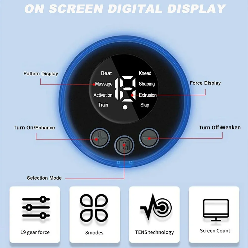 There are different intensity levels for each mode (Tapping, massage, massage, squeezing, tapping, kneading, training, shaping) Users can choose different intensities according individual needs.