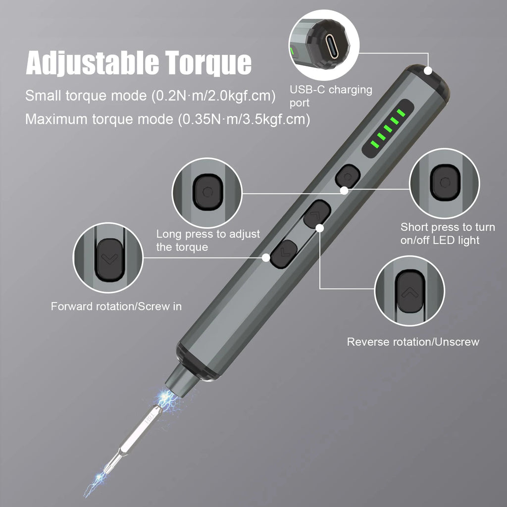 【Small & Powerful Electric Precision Screwdriver】This precision electric screwdriver has a maximum speed at 200r/min to loosen or tighten a screw quickly, Supporting both manual mode (>5 N.m) and electrical mode (torque of 0.01-0.3 N.m), powered by 350mAh rechargeable lithium battery, 60 mins charging time, and it can works continuously for 1-2 hours which is completely enough for tighten a total of 900 screws.