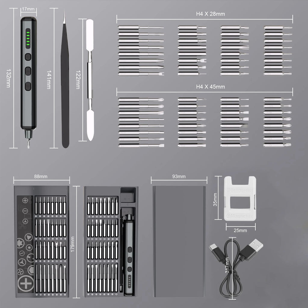 【68-IN-1 for Multi-Purpose】 This precision screwdriver set electric is equipped with 1x Electric Screwdriver Set Handle, 64 x Precision Bits, 1x Type-C USB Cable, 1 x Tweezers, 1 x Crowbar, 1 x Magnetizer & Demagnetizer Device, which are able to assemble and disassemble most electronics products, tablet computers, mobile phones, watches, electronic bracelets, camera, drones, glasses, clocks, iPad, shavers,TV remote control, precision instruments, etc., which is very suitable for people who like electronic equipment.