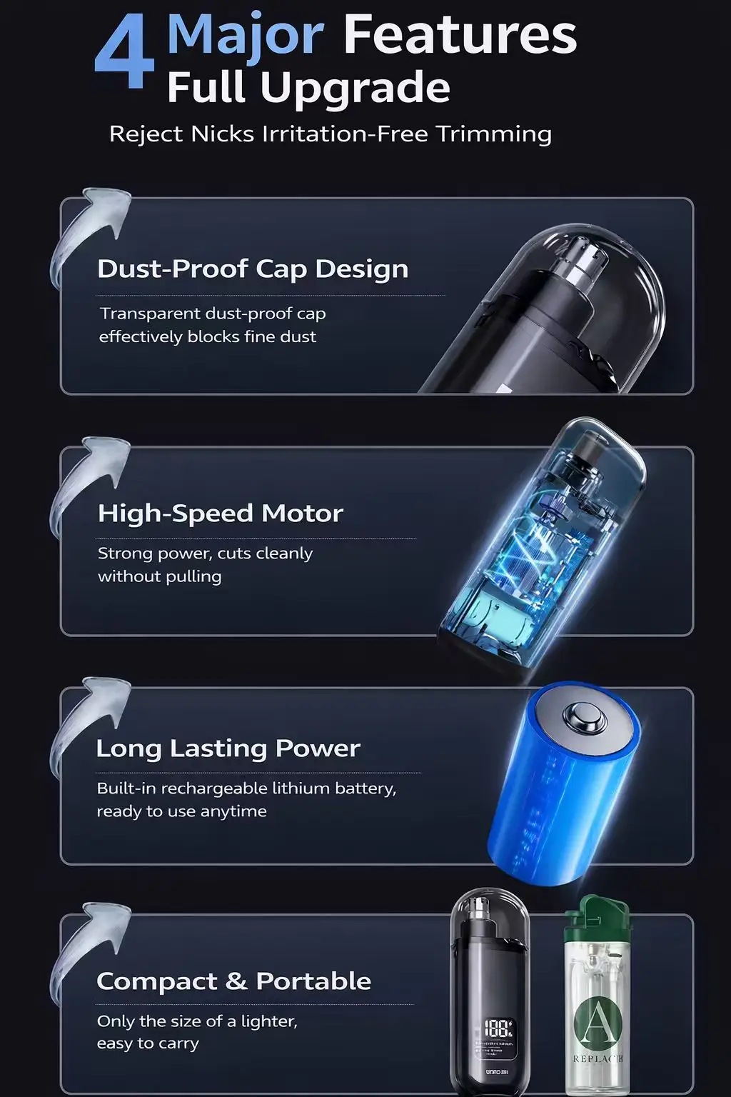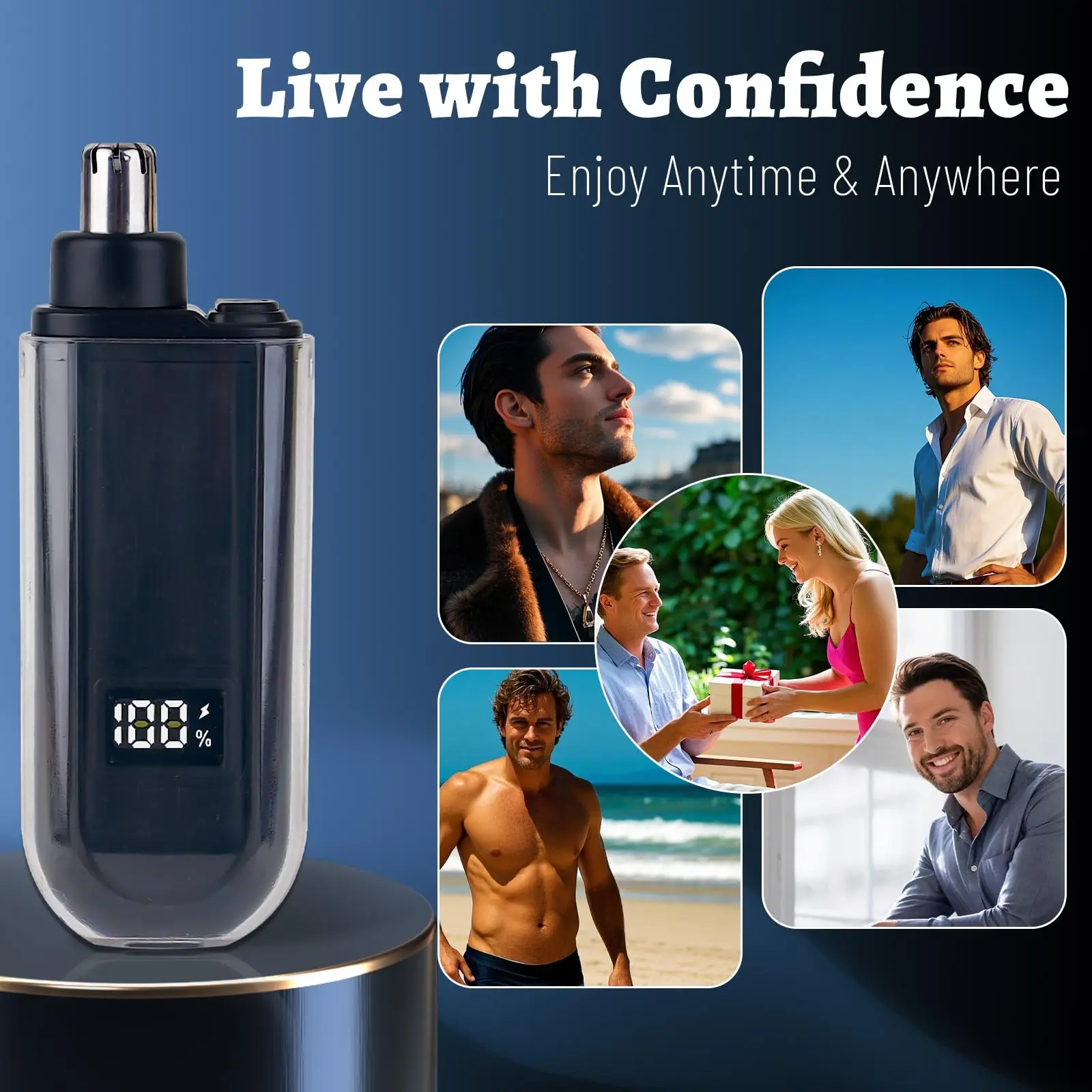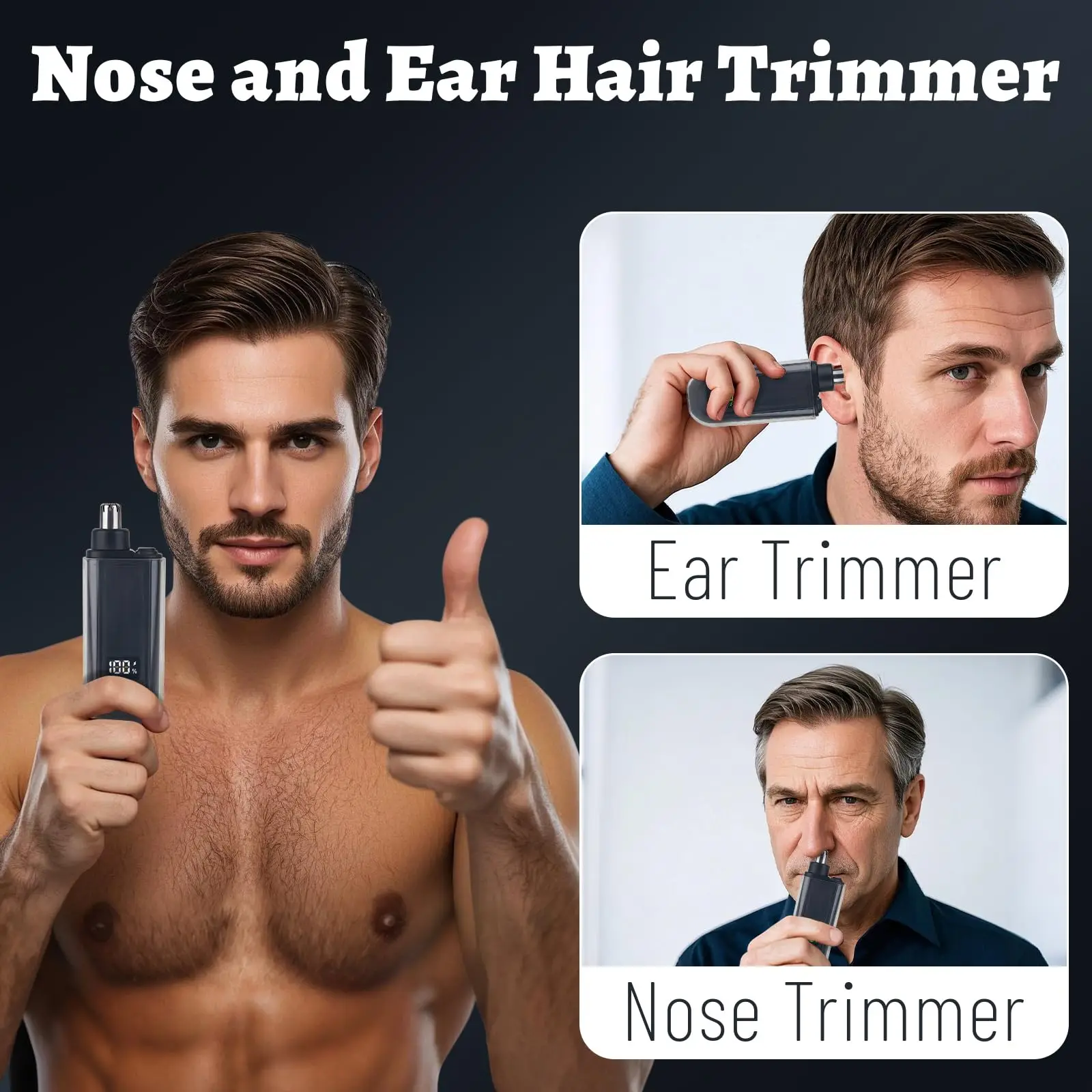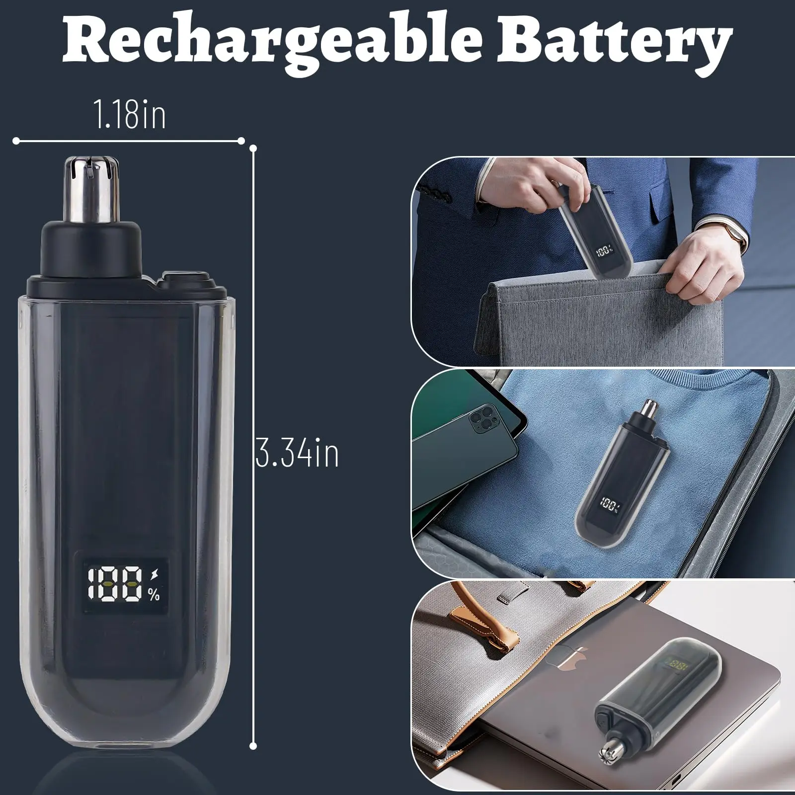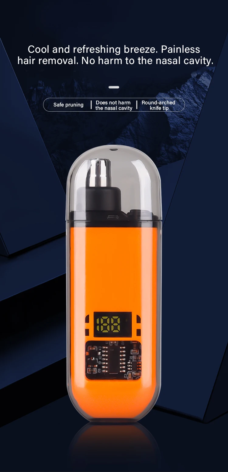 1. Equipped with a 360° rotating blade head, this electric nose hair trimmer provides comprehensive trimming and ensures that no hairs are left behind. It cuts smoothly and efficiently, without tugging or pulling. 2. Featuring a concealed, ultra-thin blade that minimizes discomfort, this rechargeable ear and nose hair trimmer provides a safe and painless experience. Its rapid rotation ensures a clean shave while avoiding contact with sensitive nasal walls. 3. Compact and stylish, the portable ear and nose hair trimmer boasts a mini design and an LED display screen for a modern aesthetic. Lightweight and easy to carry, it’s perfect for personal use or as a gift. 4. Powered by a high-torque motor for stable performance, the painless facial hair trimmer delivers effortless grooming. It trims with precision and efficiency, making your routine quicker and more comfortable than ever. 5. With Type-C charging and a 150mAh battery, the professional facial hair trimmer offers long-lasting power for extended use. 6. The detachable blade head can be easily rinsed under water to ensure cleanliness after every use.